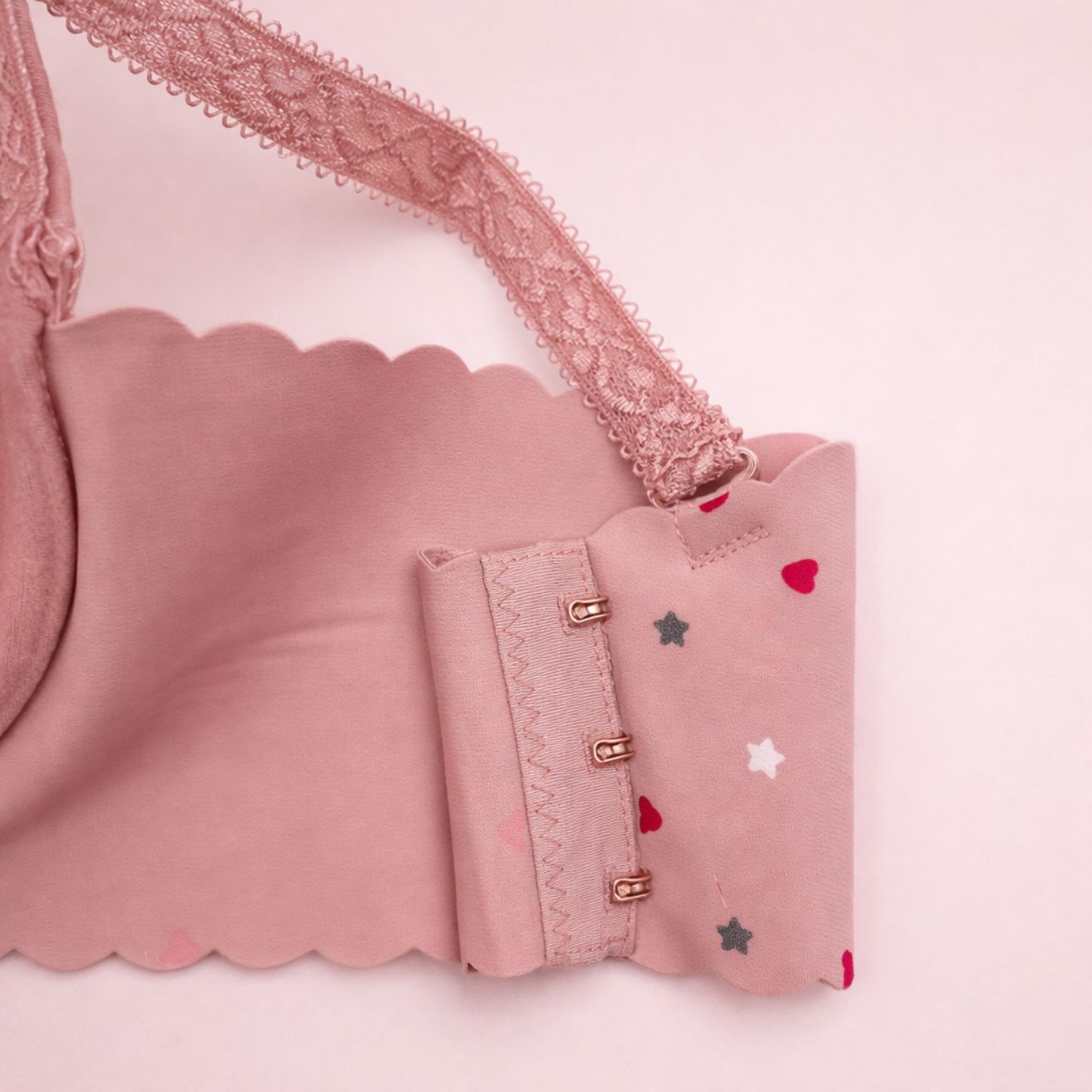 The Sweetheart Comfort Bra is designed with a light pink base and a charming heart & star printed pattern, giving it a cute yet elegant appearance. Its structured shape, soft padding, and stretchable sides make it ideal for everyday wear, offering both comfort and a naturally lifted silhouette.
